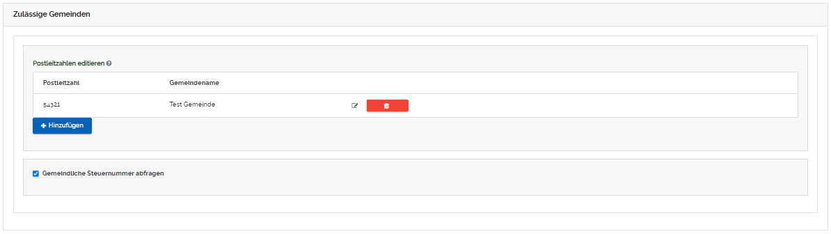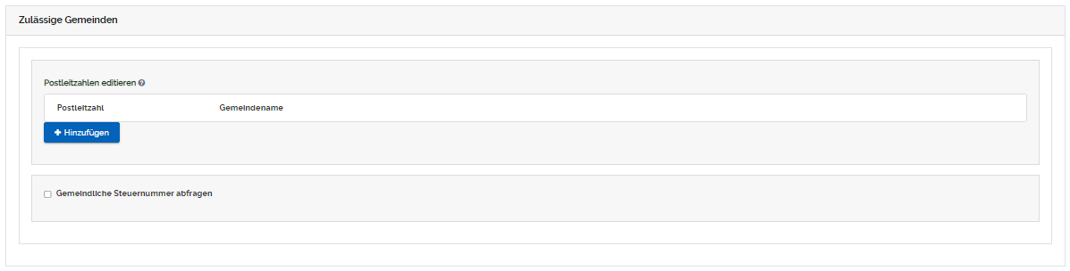Hier können Sie die Gemeinden hinzufügen, in denen ein Antrag gestellt werden kann. Der Antragsteller muss in einer dieser Gemeinden gemeldet sein. |