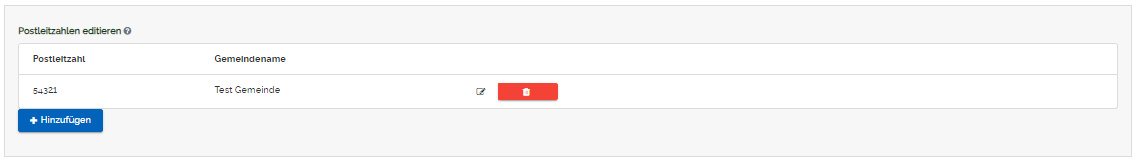 Postleitzahlen editieren: In dem Sie auf "Hinzufügen" klicken, öffnet sich die Maske, um die jeweiligen Daten einzugeben.