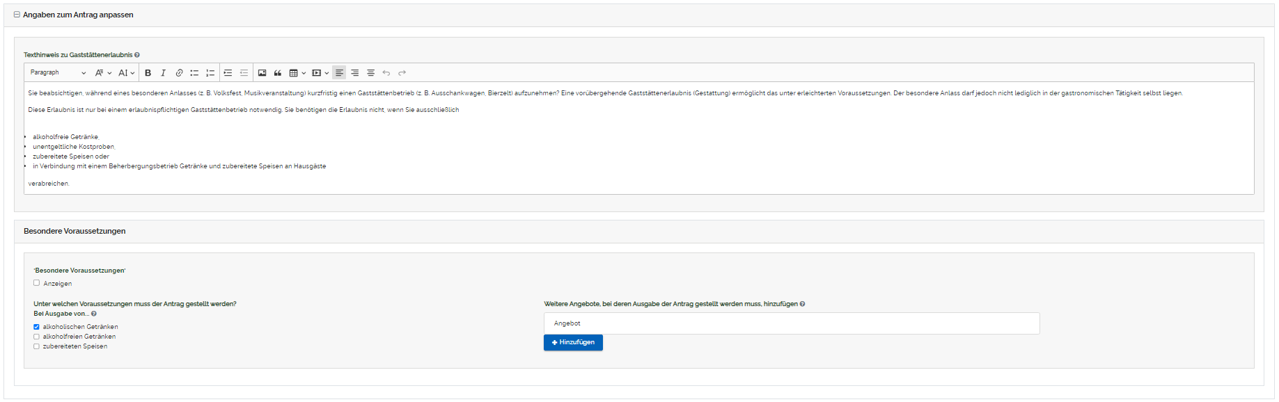 Die Seite "Antragsberechtigung" ist unterteilt in zwei Abschnitte: "Texthinweis für diese Seite anpassen" "Zulässige Gemeinden" Der Abschnitt "Texthinweis für diese Seite anpassen" befindet sich im oberen Bereich aller Seiten des Online Formulars. Eine detaillierte Erklärung zu der Komponente "Texthinweis" und wie sich diese auf die Vorschau auswirkt finden Sie hier. |