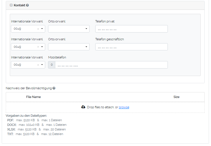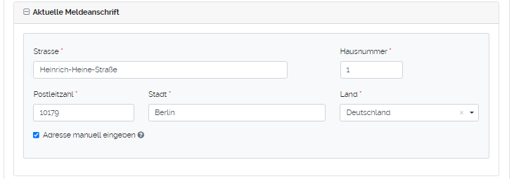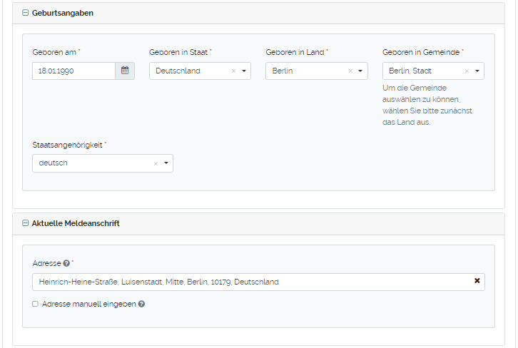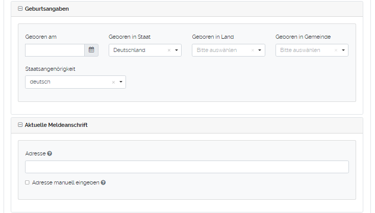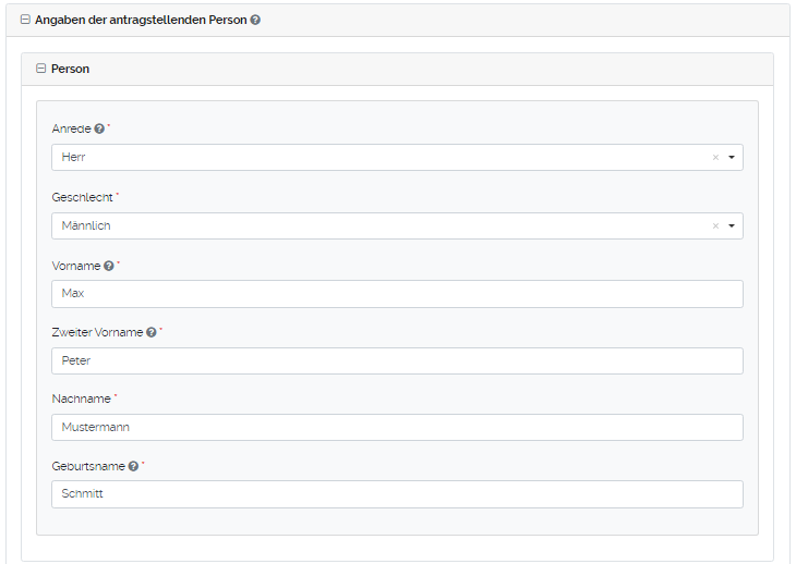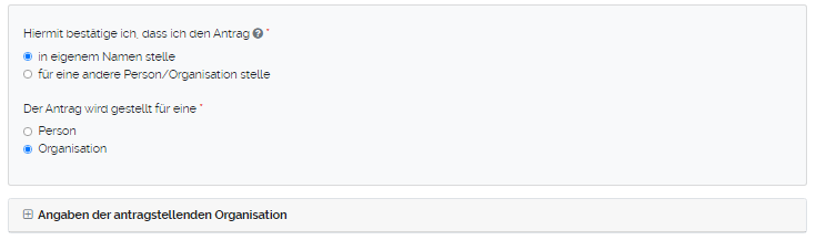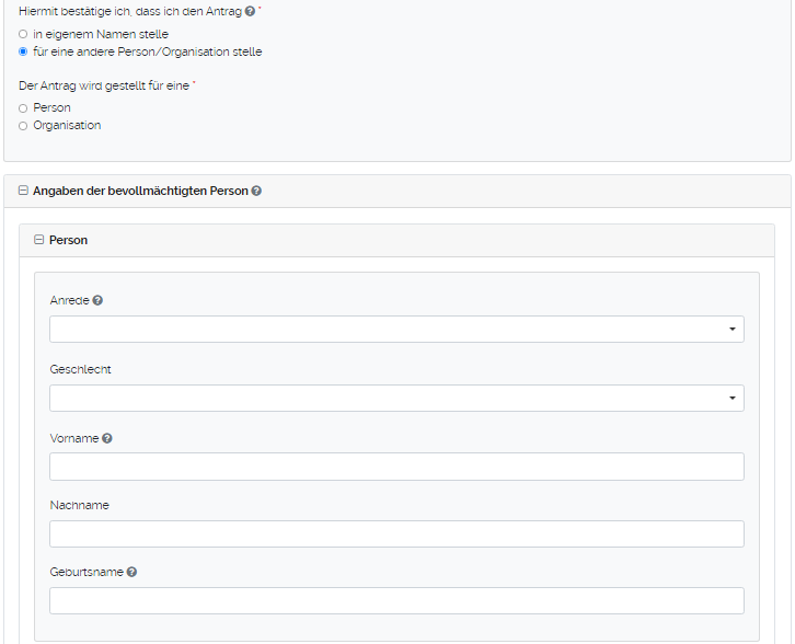 Auf der Seite "Antragsteller" werden die persönlichen Daten der Person/Organisation abgefragt, die den Antrag stellen möchte.