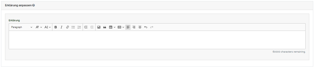 Auf der Seite "Erklärung" können Sie die Erklärung anpassen, die der Antragsteller zum Ende des Antrags bestätigen muss.