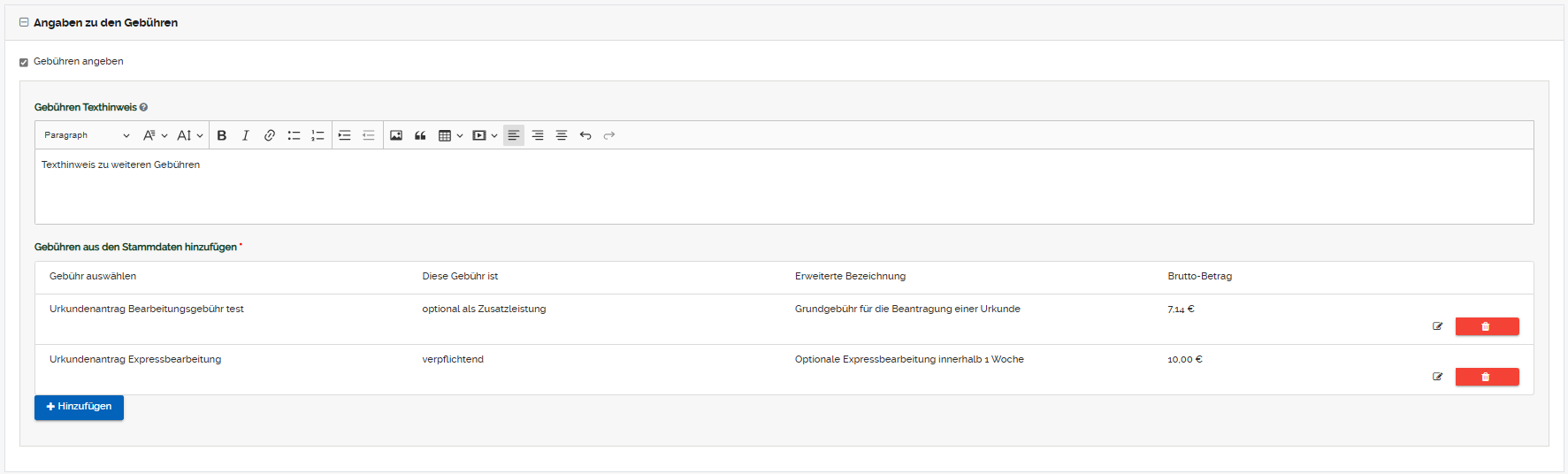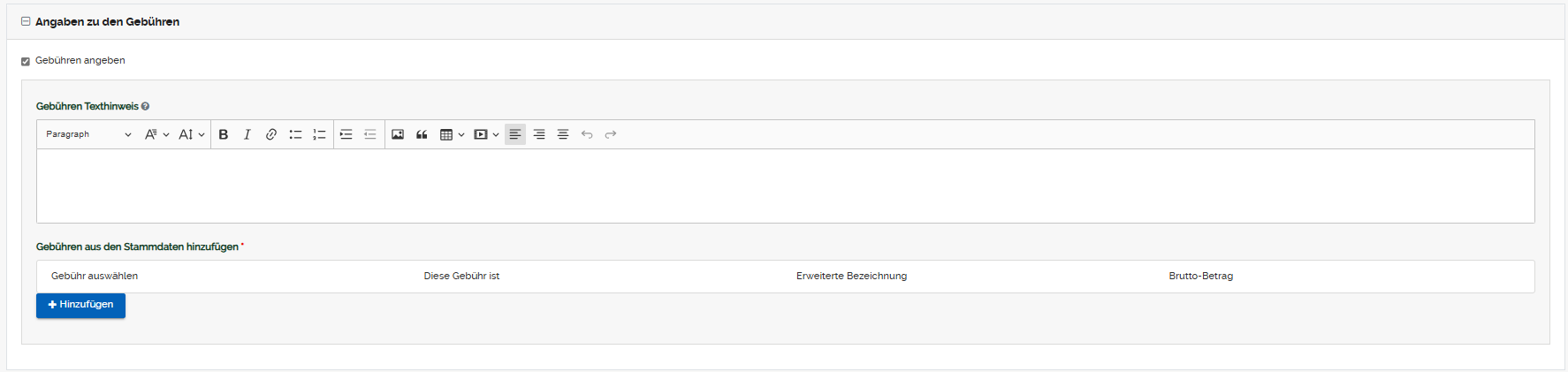 "Angaben zu den Gebühren": Möchten Sie Gebühren angeben, aktivieren Sie das Modul, indem Sie das Häkchen im Feld „Gebühren angeben“ setzen. Auch hier können Sie dem Bürger optional einen Texthinweis zur besseren Verständlichkeit hinzufügen. Fügen Sie anschließend mit einem Klick auf den Button „Hinzufügen“ eine neue Gebühr hinzu. Eine detaillierte Erklärung zu der Komponente "Texthinweis" und wie sich diese auf die Vorschau auswirkt finden Sie hier.