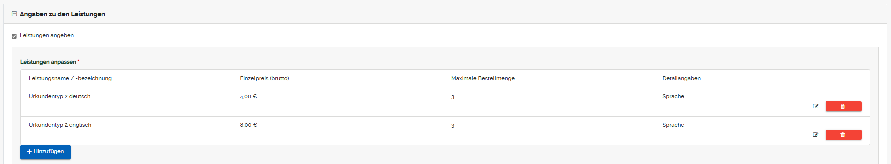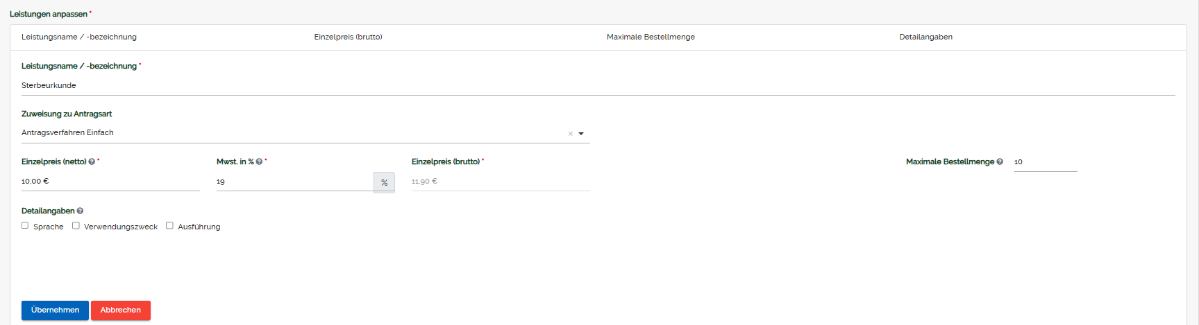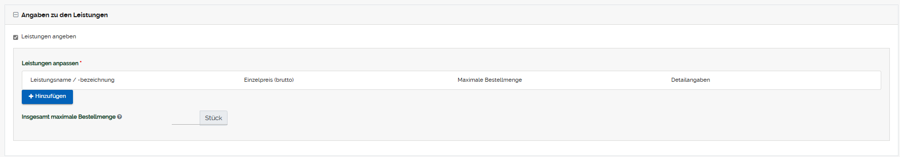 "Angaben zu den Leistungen": Sie können durch das klicken auf "Hinzufügen" die Maske öffnen, um die verschiedenen bestellbaren Leistungen einzufügen. Hier können Sie Ihren Leistungsnamen bzw. eine aussagekräftige Bezeichnung mit den für den Bürger wichtigen Informationen eintragen. Die Zuweisung der Antragsart fehlt. Wählen Sie danach den Einzelpreis netto, die maximale Bestellmenge sowie die Mehrwertsteuer in Prozent aus. Möchten Sie keine Mehrwertsteuer berechnen, geben Sie bitte den Wert „0“ ein. Der Einzelpreis brutto berechnet sich daraufhin automatisch. Geben Sie anschließend die maximale Bestellmenge an.