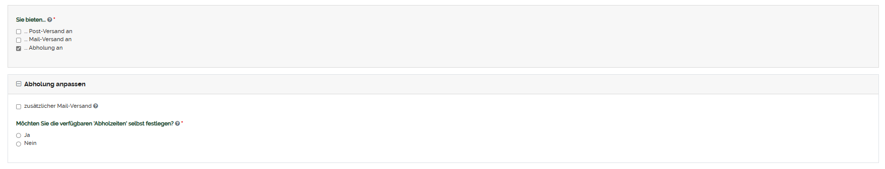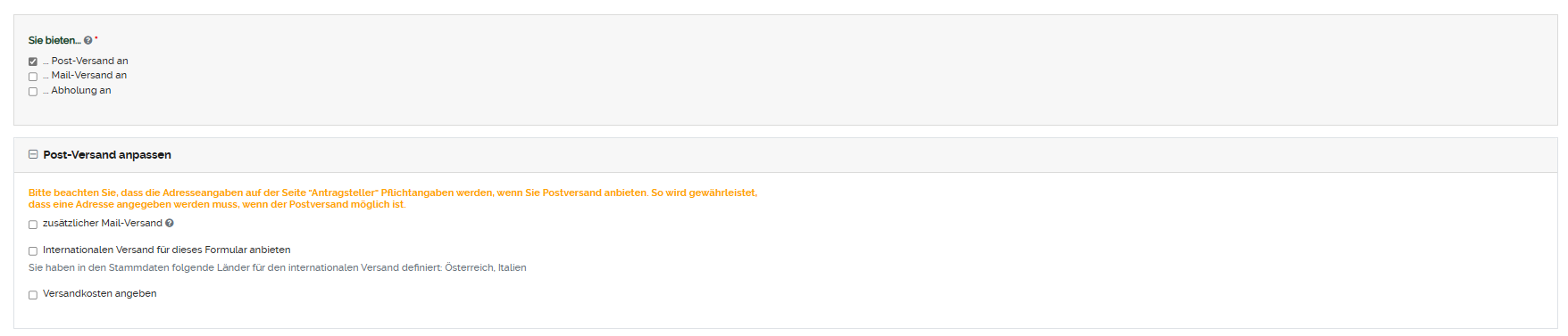 "Versand und Abholung": Im Modul „Versand und Abholung“ wählen Sie nach dem Texthinweis aus, welche der drei Optionen „Post-Versand“, „Mail-Versand“ und „Abholung“ Sie dem Antragsteller anbieten möchten. Mit dem Setzen des Häkchens öffnet sich für jede der Optionen ein Abschnitt, in dem Sie dann weitere Angaben machen können. Der Antragsteller kann eine der angegebenen Optionen auswählen.