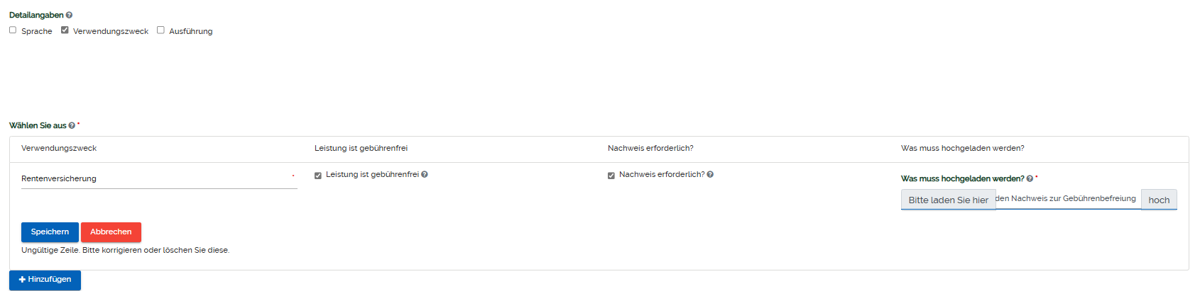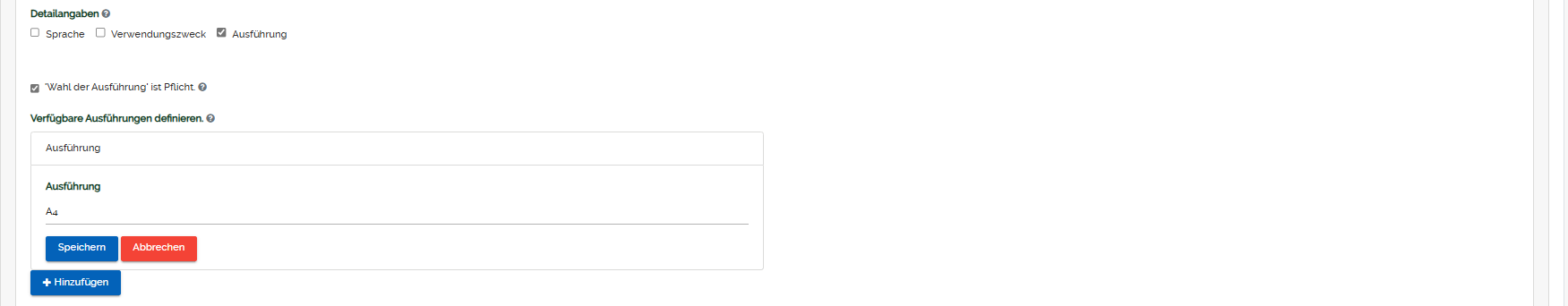 Verwendungszweck fehlt Über die Checkbox „Ausführung“ können Sie weitere individuelle Parameter wie „A4“, „Scheckkarten“, „Papier“, „Farbe“ usw. angeben. Bitte beachten Sie: Detailangaben, die den Preis beeinflussen, sollten in der Leistungsbeschreibung angegeben werden. Die verfügbaren Detailangaben werden dem Bürger erst nach dem Klicken auf die entsprechende Leistung angezeigt. Im Beispiel wird der Urkundentyp 2 einmal in „Deutsch“ für 4 € und einmal in „Britisch“ für 8 € angeboten. Dies wird dem Bürger durch die passende Leistungsbezeichnung verdeutlicht.