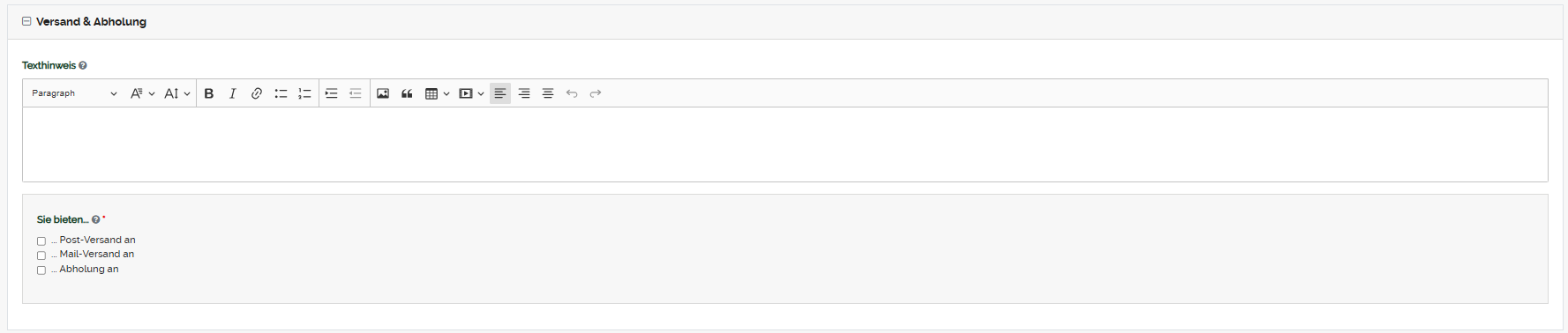 Möchten Sie die verfügbaren Abholzeiten nicht selbst angeben, hinterlegen Sie die nötigen Informationen zur Abholung für den Antragsteller im allgemeinen Texthinweis zu „Versand und Abholung“.
