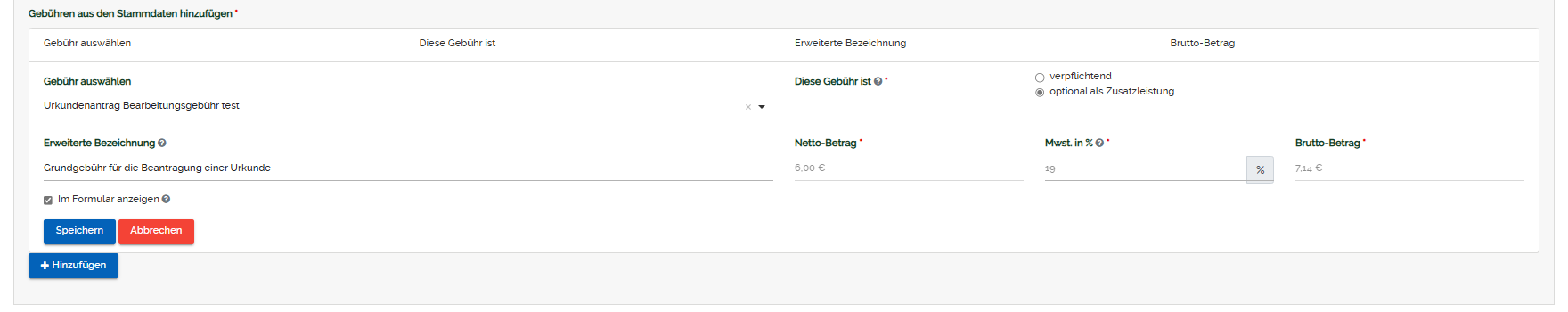 Hier wäre beispielsweise die Bearbeitungsgebühr des Antrags eine für den Bürger verpflichtende Gebühr, während eine mögliche Zusatzgebühr für den Expressversand „optional als Zusatzleistung“ von Ihnen angelegt werden kann.