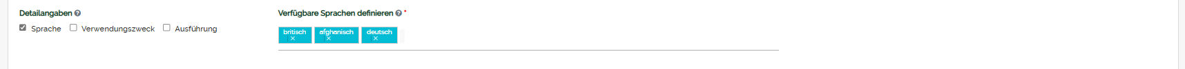 Unter dem Reiter „Detailangaben“ können Sie angeben, in welchen Sprachen die Leistung angeboten wird.