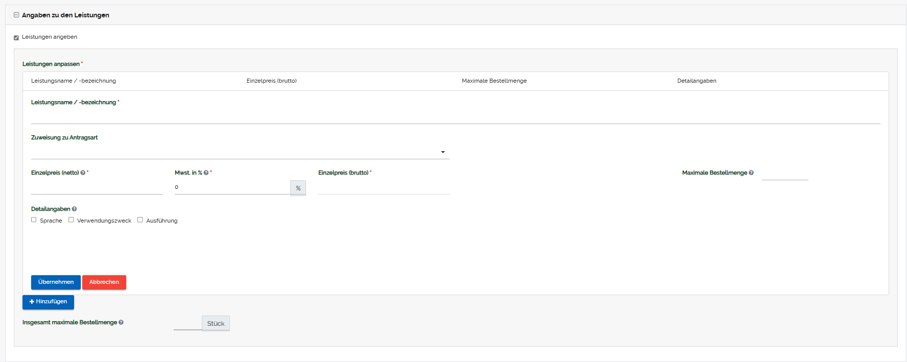 Sie können durch das klicken auf "Hinzufügen" die Maske öffnen, um die jeweiligen Daten einzufügen.