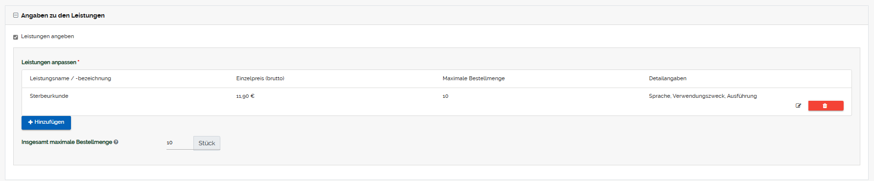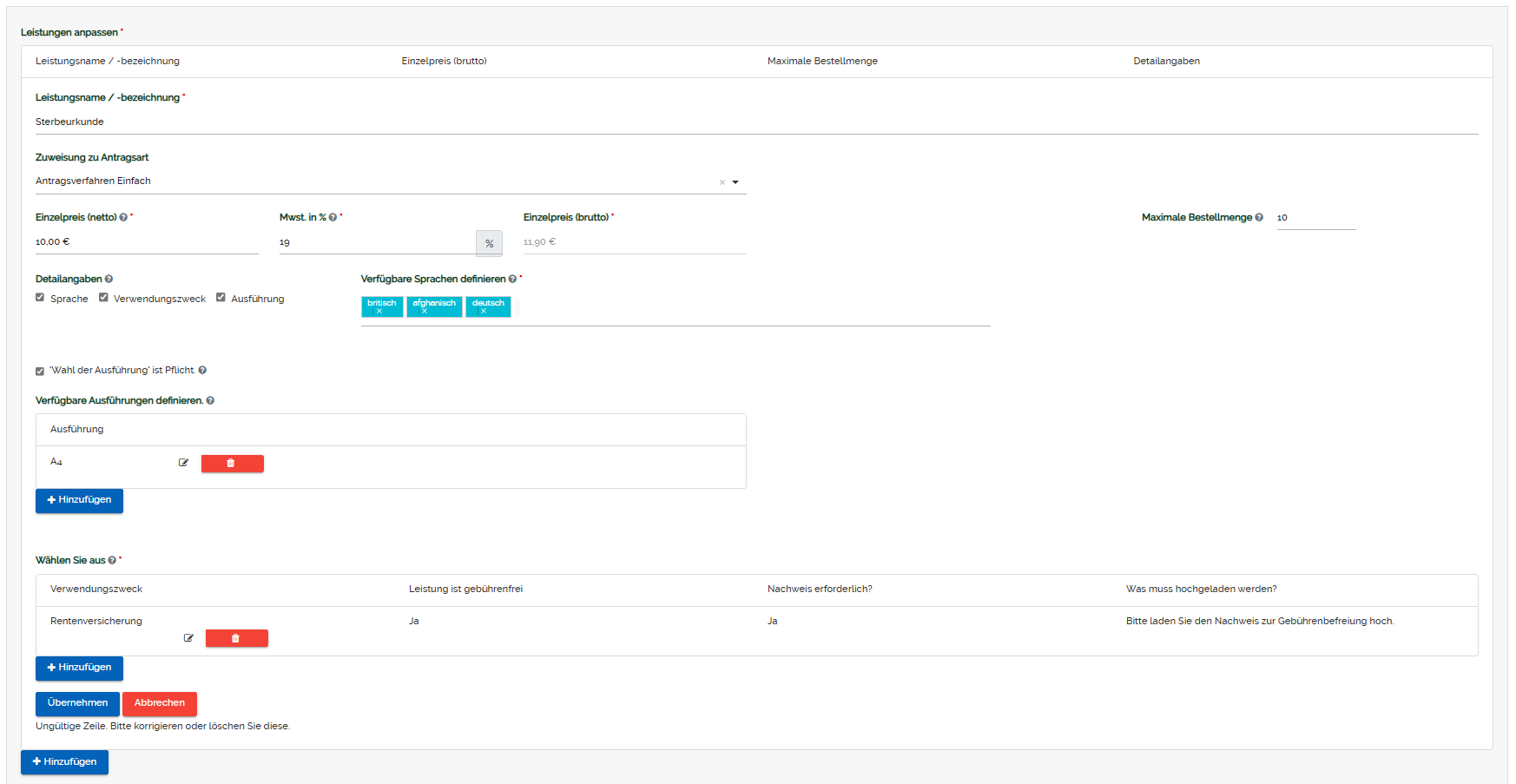 Hier wäre beispielsweise die Bearbeitungsgebühr des Antrages eine für den Bürger verpflichtende Gebühr, während eine mögliche Extra-Gebühr für den Expressversand „optional als Zusatzleistung“ von Ihnen angelegt wird.