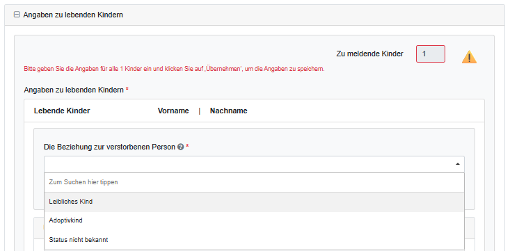 Dieselbe Abfrage findet unter "Angaben zu verstorbenen Kindern" statt.