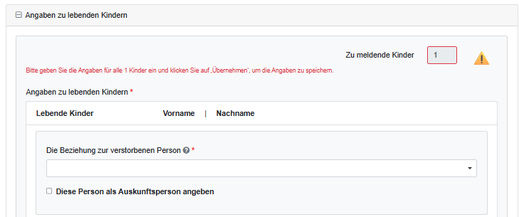 Zusätzlich wählt man aus der Liste die Beziehung der verstorbenen Person zu den lebenden Kindern aus.