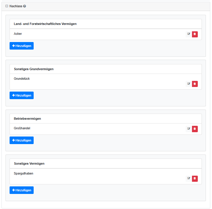 Die Seite "Angaben " "Nachlass", "Sonstiges", "Ihre Ansprechpartner" Die Ansprechpartner können Sie in der Konfiguration des Online Formulars auf der Seite "Ansprechpartner und Kontaktinformationen" anpassen. Eine Erklärung, wie Sie den Abschnitt anpassen finden Sie hier.
