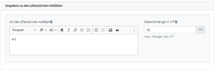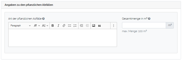 Unter "Art der pflanzlichen Abfälle" gibt man detailliert an, welche pflanzlichen Abfälle verbrennt werden sollen. Unter "Gesamtmenge in m³" notiert man das Volumen der Gesamtmenge der pflanzlichen Abfälle.