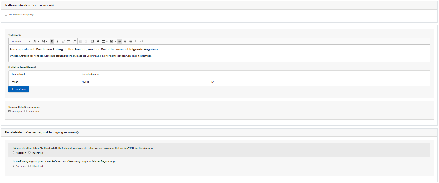 Sie können das Eingabefeld "Gemeindliche Steuernummer" im Online Formular (als Pflichtfeld) anzeigen lassen. Durch das Setzen des Häkchens in die Checkbox wird das Eingabefeld im Online Formular (als Pflichtfeld) angezeigt. Durch das entfernen des Häkchens wird das Eingabefeld im Online Formular ausgeblendet oder nur als freiwilliges Feld markiert.