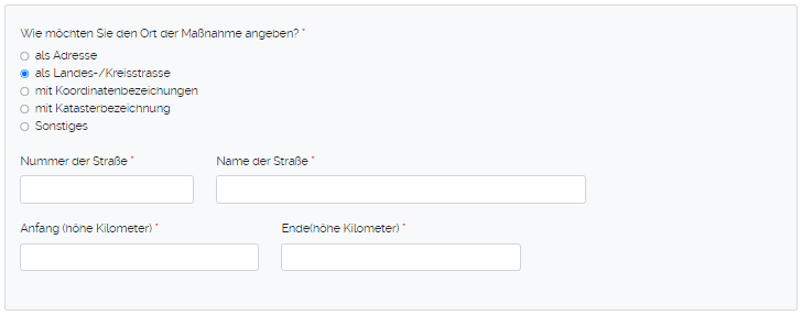 Die jeweiligen Abschnitte und Eingabefelder können Sie in der Konfiguration des Online Formulars auf der Seite "Angaben zum Ort der Maßnahme" anpassen. Eine Erklärung, wie Sie die Abschnitte anpassen finden Sie hier. |