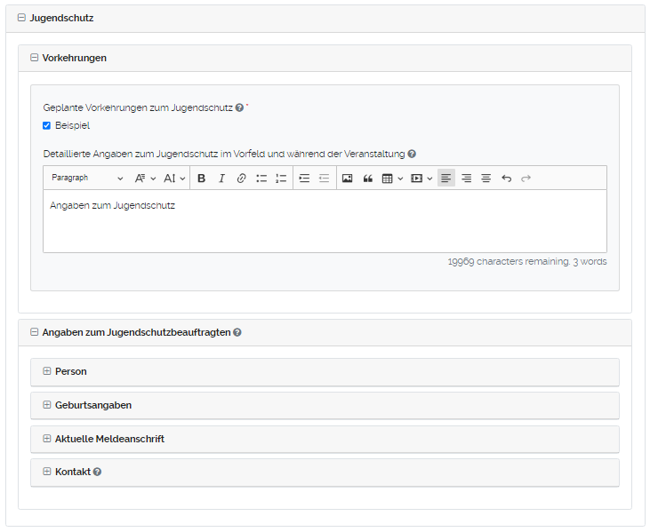Im Auswahlfeld "Geplante Vorkehrungen zum Jugendschutz", kann einer oder mehrere der Vorkehrungen, die zuvor in der Konfiguration hinterlegt wurden, ausgewählt werden. Unter "Detaillierte Angaben zum Jugendschutz im Vorfeld und während der Veranstaltung" kann man weitere Angaben zu den Vorkehrungen zum Jugendschutz machen. Unter "Angaben zum Jugendschutzbeauftragten" werden die persönlichen Angaben eingetragen.