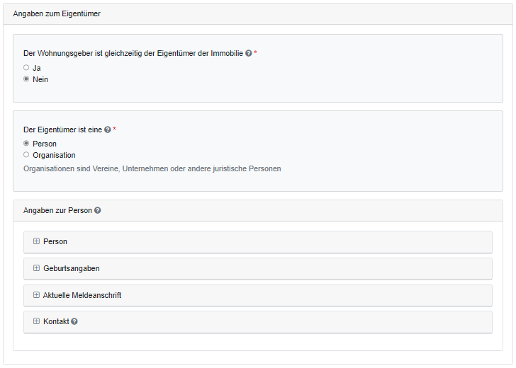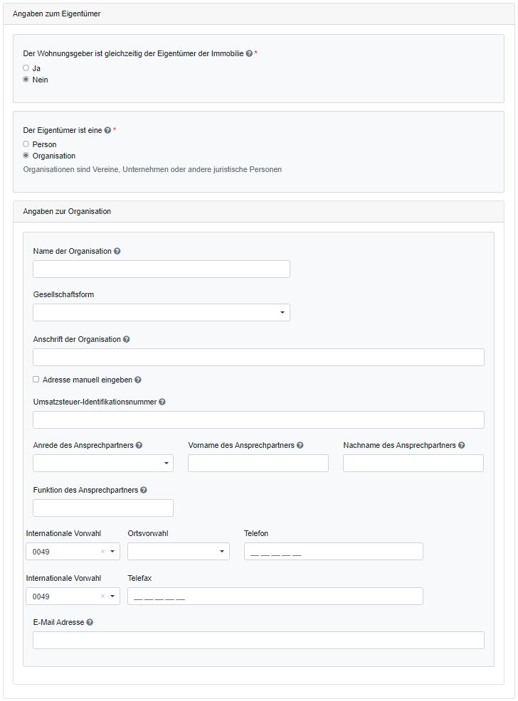 Man gibt an, ob der Wohnungsgeber gleichzeitig der Eigentümer der Immobilie ist, falls ja, wählt man aus, ob der Eigentümer die Immobilie als Selbstzweck (Eigenerklärung) nutzt.